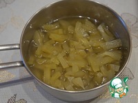 С огурцов снять кожицу, мякоть нарезать соломкой. Положить в сотейник, влить рассол, довести до кипения и снять с огня. |