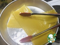 Лазаньи 4 листа отварить в горячей воде. Желательно в горячем виде лазаньи свернуть в рулет с овощной начинкой, так листы не будут рваться. Я надела перчатки было не очень горячо. |