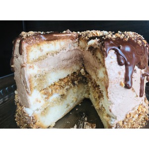 Описание: Очень пушистый, ароматный бисквит, с прослойкой крема чиз, карамели с добавлением орехов и шоколадного крема.