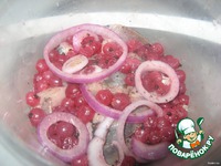 Кусочки сельди уложить в глубокую посуду, прослаивая смородиной и луком. |
