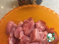 Мясо куриных бедрышек нарезать удобными для жарки кусочками, примерно 4х4 см.. |