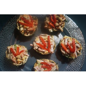 5. Корзинки заполняем готовым салатом. Украшаем красным перцем.