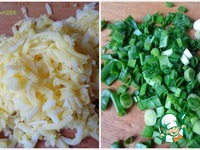 Картофель натереть на терке. Зеленый лук порезать колечками. |