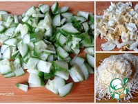 Огурец и яйца нарезать произвольно. Оставить немного огурца для оформления. Сыр нашинковать. |