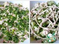 Третий слой - зеленый лук, на который разложить огурец, смазать майонезом, подсолить. |