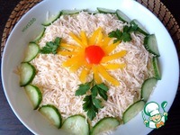 Закрыть всю поверхность салата нашинкованным сыром. Оформить на свое усмотрение. В данной салате для оформления использован сладкий перец, огурец и зелень петрушки. Приятного аппетита!!! |