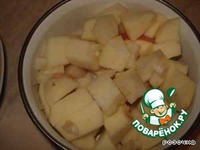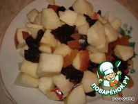 Желательно брать кислое яблоко. Если его нет, режем на кусочки, какое есть яблоко, и смешиваем его с соком 1/2 лимона. |