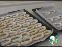 Берем один кусок теста, раскатываем его в полоску и формируем руками печенье в виде подковки. выкладываем на застеленный пергаментом противень. |