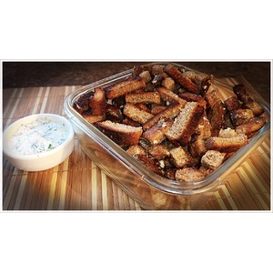 1) Нарезаем хлеб на сухарики, перекладываем на протвинь и отправлением в духовки при 180 С на 15 - 20 минут.