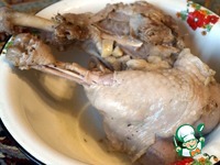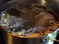 Голени залить водой, довести до кипения, снять пену, добавить стебель сельдерея, сухие коренья, острые перчики, букет Гарни, варить на среднем огне 2 часа. Примерно через час посолить. |