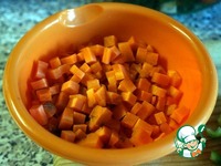 Перец освободить от семян и перегородок, тоже порезать кубиком. |