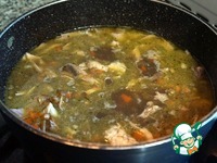 За пять минут до окончания варки отправить в суп зажарку, вернуть мясо. |