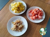 3) Лук нарезать тонкими полукольцами, обжарить до золотистого цвета. Отварить картофель, порезать кубиками. Рыбу порезать кубиками. |