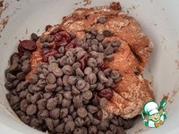 Добавить к муке молоко с маслом и яйцо. Хорошо смешать. У меня комбайном 3-4 минуты. Добавить шоколадные капли, или кусочки шоколада и вишню. |
