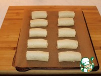 Тесто раскатываем в пласт толщиной 5 мм. Обрезаем края и делим на части. Выкладываем начинку. |