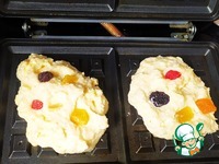 На каждую вафельную панель выложить по полной столовой ложки творожного теста. Сверху распределить изюм и цукаты. Закрыть мультипекарь REDMOND. Выпекать творожные вафли 7 минут. |