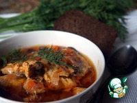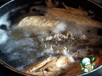 Описание: Для бульона я использовал остов крупной щуки – до этого готовил малосольную и фаршированную, филе и голова ушли, хребет остался. А в качестве основной рыбы взял небольшую горбушу – граммов 700-800, точнее не скажу: не взвешивал. Грибы использовал тоже те, что остались от другого блюда: для фаршированных шампиньонов нужны были только шляпки, ножки остались. Вот и пригодились.