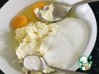 Смешать в миске -250 гр. творога, 2 яйца,250 гр. сахара и разрыхлитель. |