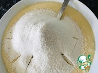 Смешать муку с ванильным сахаром, частями просеять в яично-творожную смесь. У меня ушло 300 грамм муки. |
