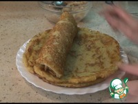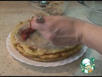 На картофельный блинчик выкладываем 1\3 начинки, распределяем по всему блинчику. |