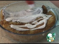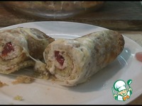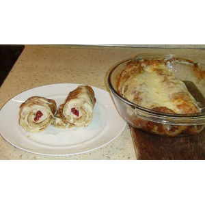 Огнеупорную форму смажем растительным или сливочным маслом. Выкладываем сформированные рулеты. Сверху смажем сметаной. Отправляем в духовку, запекаем при 180 градусах 30 минут. |