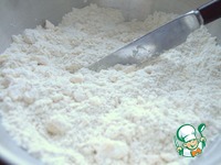 Нарезать масло из холодильника в муку с разрыхлителем и солью. |