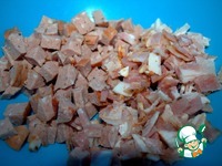 Начинка. Нарезать колбасу (у меня с чесноком и тмином, популярная в Латвии) и бекон или что-то одно. |