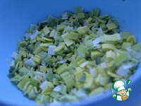 Нарезать зелёный лук. У меня порей. Удобно заранее разрезать вдоль и промыть стебель, затем нарезать мелко и убрать в коробку с крышкой в холодильник. Потом достаём и добавляем в салаты или пироги. |