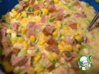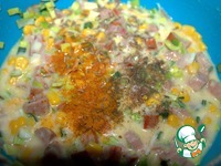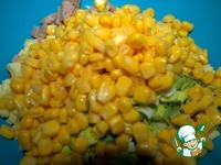 К мясному добавляем натёртый сыр, лук и кукурузу. |