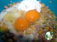 Залить сметаной или кефиром. Вбить яйца и всыпать крахмал. |