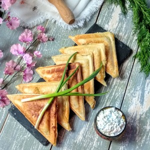 Описание: Аппетитные слоёные треугольники с творогом и зеленью - это отличная закуска, которую легко приготовить из самых доступных ингредиентов. В этом нам с лёгкостью поможет в мультипекарь Redmond.