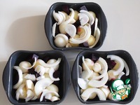 Следующим слоем крупно нарезанный полукольцами лук. Сверху немного присолить. |