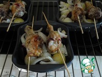 Голени нанизать на шпажки и разложить поверх овощей. Духовка разогрелась до нужной t, поставить в неё наполненные формы, |