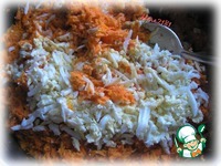 Затем вторым слоем аккуратно выкладывать морковно-яичную начинку. Декорировать можно петрушкой, яйцом, оливками или по собственному желанию. |