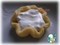 После выпекания тарталетки должны остыть и тогда можно их начинить. Нижним слоем выложить сметанно-оливковый крем. |