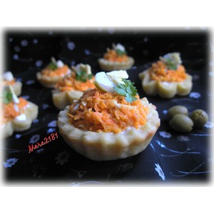 Описание: Закусочные пирожные из картофельного теста с начинкой из моркови и яиц. Нежность и сочность тарталеткам придаёт сметанно-оливковый крем. Такой вариант пирожных хорошо подавать к чаю, кофе либо в виде холодной закуски к коктелям, а также перед обедом.