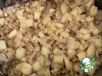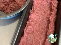 Форму для кекса (моя 29•9•6) смазываем растительным маслом и выкладываем 2/3 фарша. Делаем посередине углубление для начинки, формируем бортики. |
