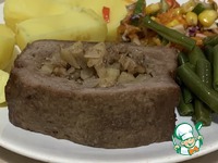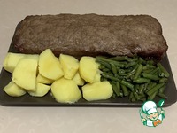 Достаем рулет из формы. На гарнир у меня стручковая фасоль и отварной картофель. |