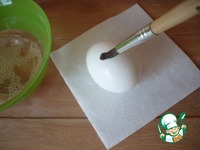 Наложите элемент декора и промажьте его кисточкой, смоченной в белке. Делаем это, от центра к краям. Так украшаем все яйцо. |