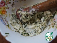 Пока тесто поднимается, сделаем начинку. Мягкое сливочное масло смешаем с измельченным укропом и пропущенным через пресс чесноком. |