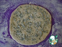 Тесто разделим пополам. На припыленной мукой рабочей поверхности, руками, аккуратно сделаем лепешку. Половину начинки обильно нанесем на поверхность лепешки. |