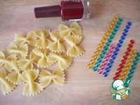 Для украшения "яйца из макарон" я взяла макароны бантики, покрасила их маникюрным лаком и приклеила цветные стразы. |