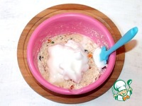 2. Хлопья залить теплым кефиром, прогретым до комнатной температуры. Добавить сахар (можно по вкусу) и перемешать. Оставить миску в сторону на 15 минут для "набухания" хлопьев. |