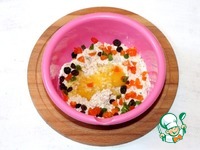 4. К хлопьям добавить мелко порезанные цукаты, изюм, ванилин и мед, перемешать. Замесить тесто. |