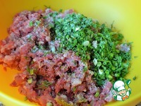 Мясо вымыть, обрезать от плёнок. Измельчить с луком на мясорубке, мне нравится крупный помол, это по вкусу. Добавить рубленую зелень, посолить, поперчить. Влить 50 мл. холодной воды. |
