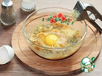 4. Добавляем яйцо, прессованный чеснок (2 зуб.), перец молотый и соль, перемешиваем. |