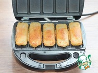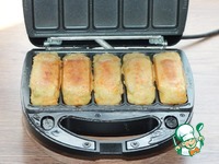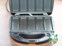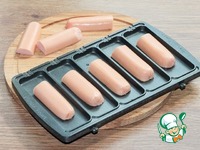 10. Открываем крышку мультипекаря и равномерно раскладываем тесто по 1 ст. л. на нижнюю панель прибора. Раскладываем сосиски. |