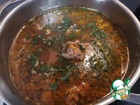 Добавляем зелень (укроп и петрушка, у меня в этот раз замороженные), накрываем крышкой, убираем с горячей плиты, пусть постоит еще 5 минуточек. |
