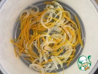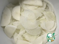 Готовим маринад. Для этого лук нарезаем полукольцами и отправляем в кастрюлю. |
