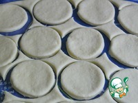 Раскатываем тесто и вырезаем кружки - на каждую булочку нам понадобится 5 кружков теста. Обрезки опять раскатываем. У меня в итоге получилось 4 булочки. Вырезала кольцом диаметром 7 см. |